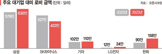 29일 재계와 미국 정치자금 추적 단체 '오픈시크릿'에 따르면 지난해 삼성그룹(삼성반도체·삼성전자아메리카·삼성SDI아메리카)의 미국 로비자금은 630만달러(84억2184만원)로 사상 최고치를 기록했다. 고용한 로비스트도 67명으로 전년 대비 12명이 늘며 사상 최고치를 경신했다. 미국에서 로비는 합법적인 활동으로 인정되는 만큼 국내 기업뿐 아니라 각국 정부도 적극 활용하고 있다.