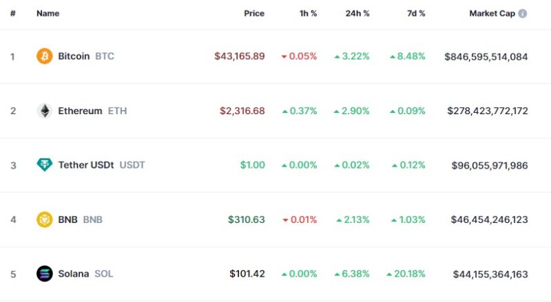 비트코인뿐만 아니라 다른 암호화폐(가상화폐)도 일제히 상승하고 있다. 시총 2위 이더움은 2.90%, 바이낸스코인은 2.13%, 솔라나는 6.38% 각각 상승하고 있다.
