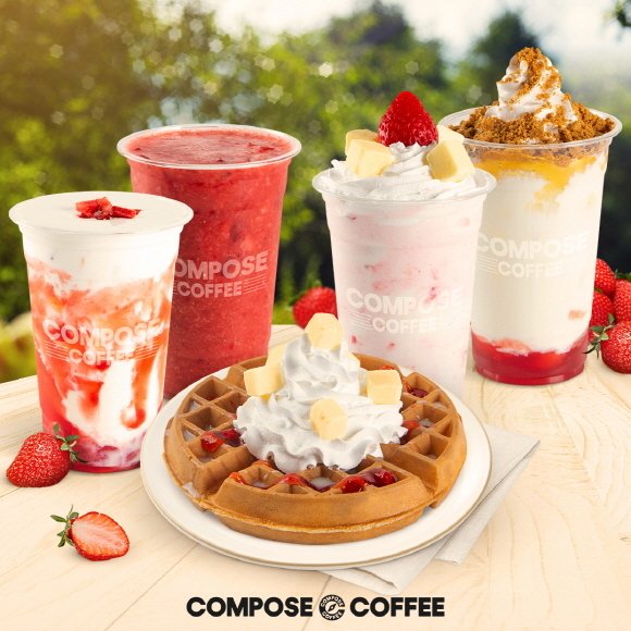 컴포즈커피는 계절에 상관없이 상시 즐길 수 있는 딸기 메뉴 3종(딸기라떼, 딸기요거트스무디, 딸기스무디)과 지난달 시즌 한정 메뉴로 선보인 신메뉴 4종(딸기치즈스무디, 딸기연유라떼, 딸기애플잼라떼, 국내산 딸기주스)을 판매 중이다.