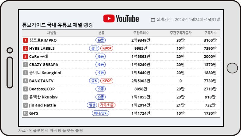 튜브가이드 1월 마지막주 국내 유튜브 채널 랭킹