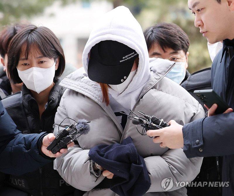 경찰 승합차에서 내린 A씨는 수갑을 찬 두 손을 헝겊으로 가렸고 모자에 마스크를 써 얼굴 노출을 최대한 피했다.