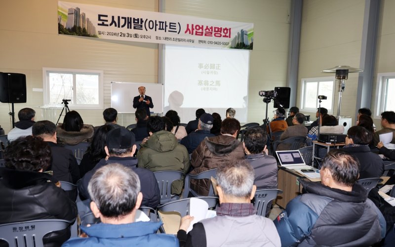 5일 관련 업계에 따르면 세종내판지구 도시개발사업 주식회사는 지난 3일 연동면 한 사무실에서 토지주 100여명을 상대로 도시개발사업 설명회를 열었다.