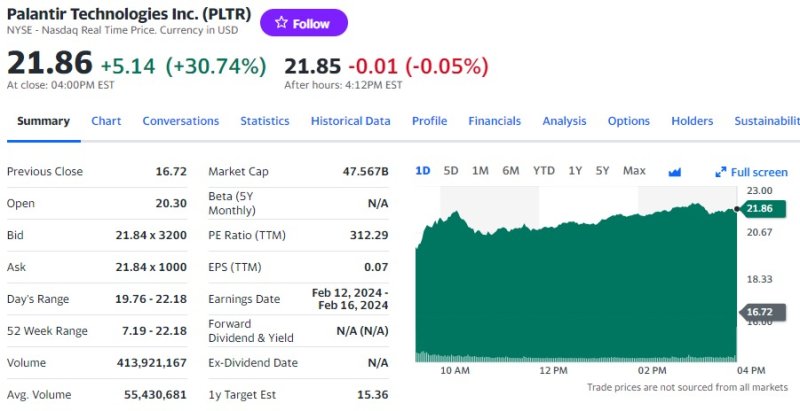 이날 뉴욕증시에서 AI 데이터 전문업체 팔란티어는 전거래일보다 30.74% 폭등한 21.86달러를 기록했다.