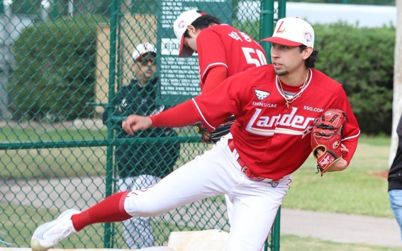 더거는 SSG 유니폼을 입고 한 첫 불펜투구에서 빠른 공을 던지며 기대감을 키웠다.