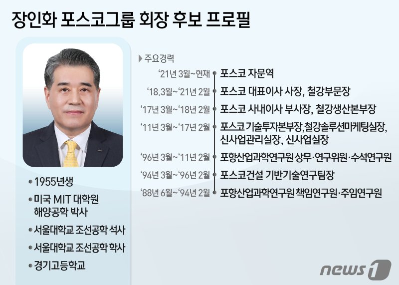 장 전 사장은 1955년생으로 서울대 조선공학과를 졸업하고 포스코에 입사해 포스코 철강솔루션마케팅실장과 포스코 신사업실장, 포스코 철강2부문장(대표이사 사장) 등을 지냈다. 현직 시절 그룹 안팎으로 친화력이 뛰어나고, 신사업에 대한 지식과 이해력이 높다는 평을 받았다. 지난 2018년 차기 회장 선임 당시 최정우 현 회장과 마지막까지 경쟁을 벌였다.