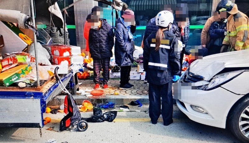 8일 전북 김제경찰서와 전북소방에 따르면 이날 오후 1시11분께 김제시 요촌동의 한 전통시장 인근 도로에서 A씨(60대·여)가 몰던 소나타 승용차가 정차돼 있던 1톤 트럭과 행인을 들이받았다.