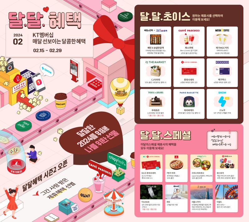 달달스페셜에서는 △7번가피자 프리미엄스페셜 라지사이즈 50% 할인 △크리스피프레시 샐러드 30% 할인 △원스토어 게임 카테고리 50% 할인 쿠폰(최대 1만원) △TOUN28 1만 5천원 할인(2만원 이상 구매 시) △홈트레이닝 서비스 콰트 1개월 무료 이용 △서울스카이 카페 아메리카노 또는 아이스티 1잔 무료 △이월드 자유이용권 본인 50% 및 동반 3인 30% 할인 등을 제공한다.