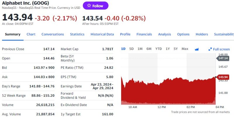 15일(현지시간) 뉴욕증시에서 알파벳은 전거래일보다 2.17% 급락한 143.94달러를 기록했다.