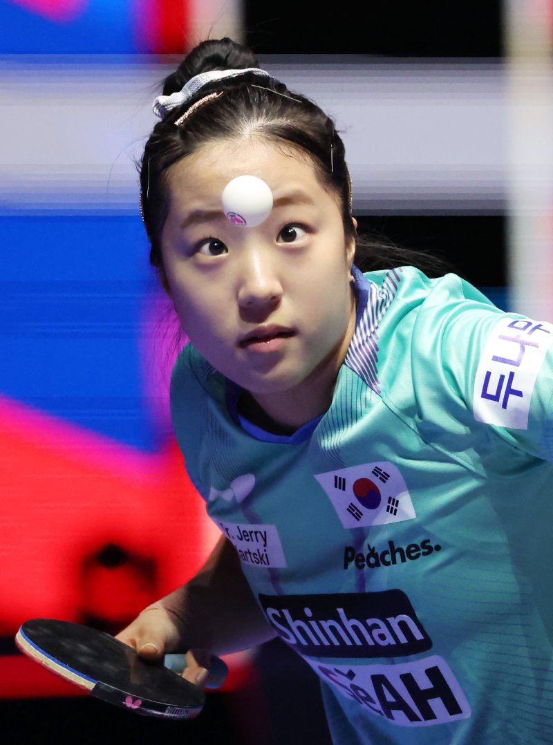 [부산=뉴시스] 하경민 기자 = 16일 부산 해운대구 벡스코 제1전시장 특설경기장에서 열린 'BNK부산은행 2024부산세계탁구선수권대회'에 출전한 한국 여자 대표팀 신유빈 선수가 이탈리아 스테파노바 니콜라타 선수를 상대로 서브를 넣고 있다. 2024.02.16. yulnetphoto@newsis.com [서울·부산=뉴시스]최진석 하경민 박대로 기자 = 전지희(미래에셋증권)와 신유빈(대한항공)이 이끄는 여자 탁구 대표팀이 'BNK부산은행 2024 부산세계탁구선수권대회' 첫 경기에서 승리를 따냈다.