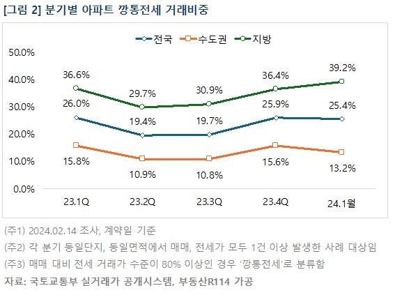 아파트 실거래가 자료를 통해 매매 대비 전세가 비율이 80% 이상으로 '깡통전세'가 의심되는 거래비중을 살펴봤더니 지난해 2분기 19.4%에서 4분기 25.9%로 증가했다. 지역별로 보면 전북(57.3%), 충북(55.3%), 경북(54.2%), 경남(48.1%) 등 지방 위주로 높고 서울(5.1%), 세종(7.5%), 제주(12.9%), 경기(19.0%), 인천(19.9%) 등은 낮게 나타났다.