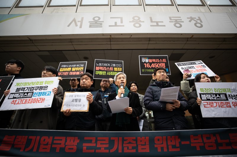 (서울=뉴스1) 김민수 기자 = 시민사회단체가 물류센터 채용을 제한하는 이른바 '블랙리스트' 의혹이 제기된 쿠팡을 경찰에 고발했다.