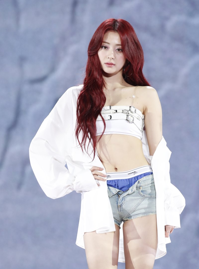 레드빛 긴 웨이브 헤어에 파격적인 팬츠리스룩 입고 등장한 허윤진은 인형 같은 비주얼에 군살 하나 없는 완벽한 몸매로 시선을 사로잡았다.