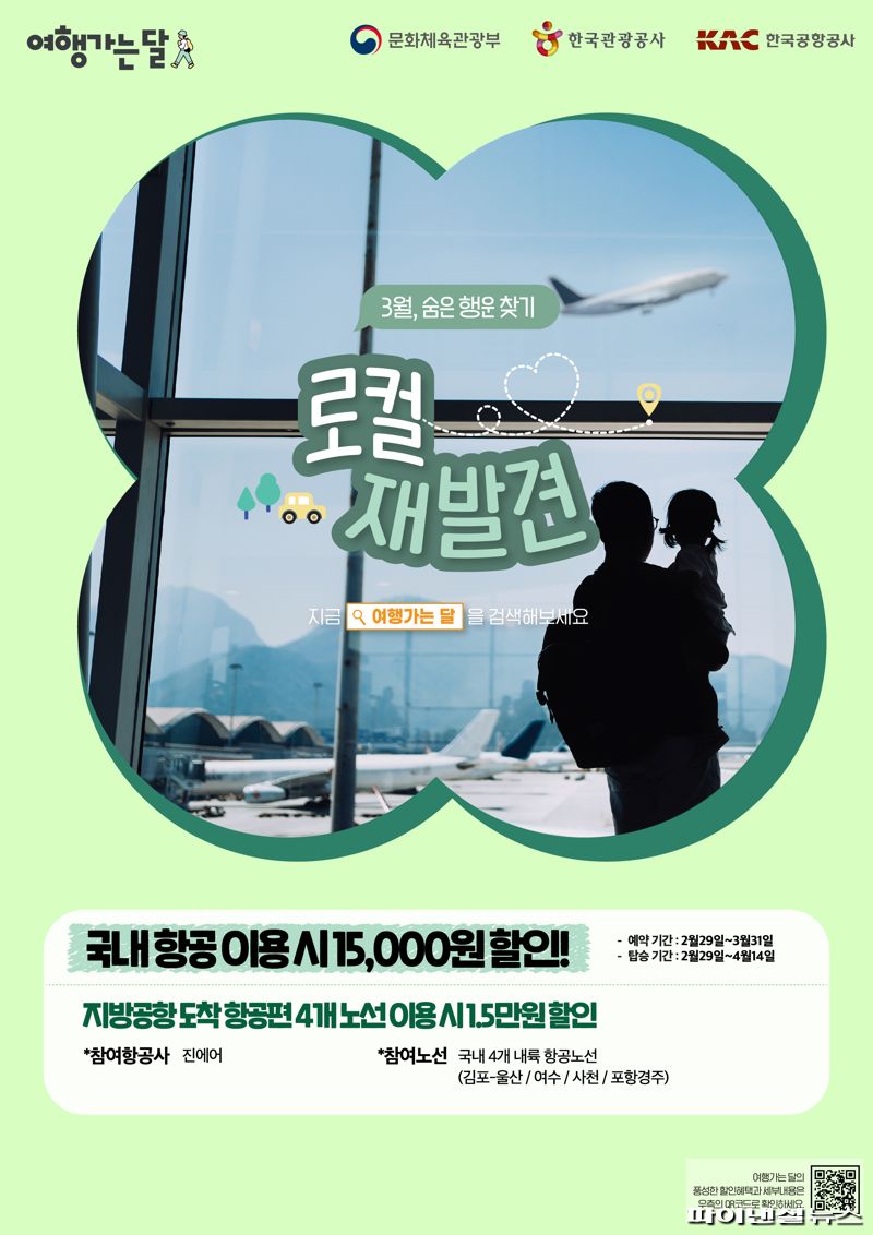 [파이낸셜뉴스] 한국공항공사는 '3월 여행가는 달'을 맞아 문화체육관광부, 한국관광공사, 진에어와 함께 봄철 내륙노선 항공권 할인 프로모션을 진행한다고 20일 밝혔다.