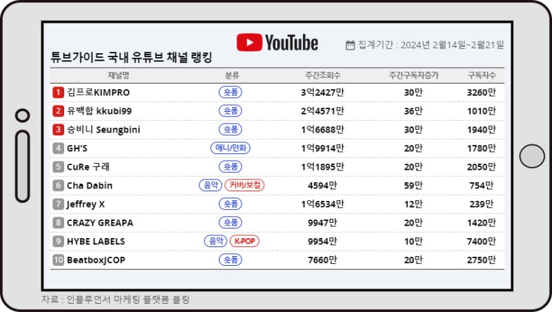 22일 튜브가이드는 인플루언서 마케팅 플랫폼 '블링'의 구독자수·조회수 데이터를 기반으로 산정한 2월 셋째주 국내 유튜브 채널 차트를 발표했다.