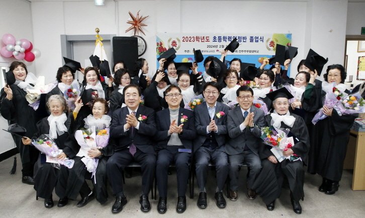 23일 전북 전주주부평생학교에서 ‘제8회 초등학력 인정 졸업식’이 개최됐다. 졸업식에는 우범기 전주시장과 이기동 전주시의회 의장, 졸업생과 가족 등이 참석했다.