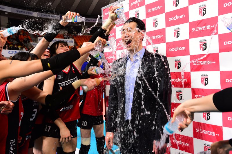 고희진 감독은 인터뷰를 마친 뒤 선수들에게 물세례를 맞았다. 경기 후 수훈 인터뷰를 사령탑이 한 것도 이례적이지만, 선수들이 달려들어 물을 뿌린 것도 매우 드문 장면이었다.
