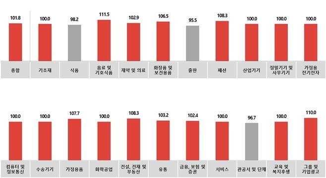 해당 업종 광고주 중 광고 지출이 늘어날 것이라 응답한 사업체가 많을수록 100을 넘고, 반대면 100 미만이 된다.