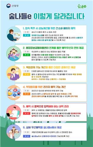 이번 숲나들e 기능 개선은 지난해 국립자연휴양림 이용자를 대상으로 한 민원 분석 결과와 국민디자인단의 요구사항 등을 반영해 이용자 입장에서 불편 사항을 해소하는 데 중점을 둬 추진됐다.