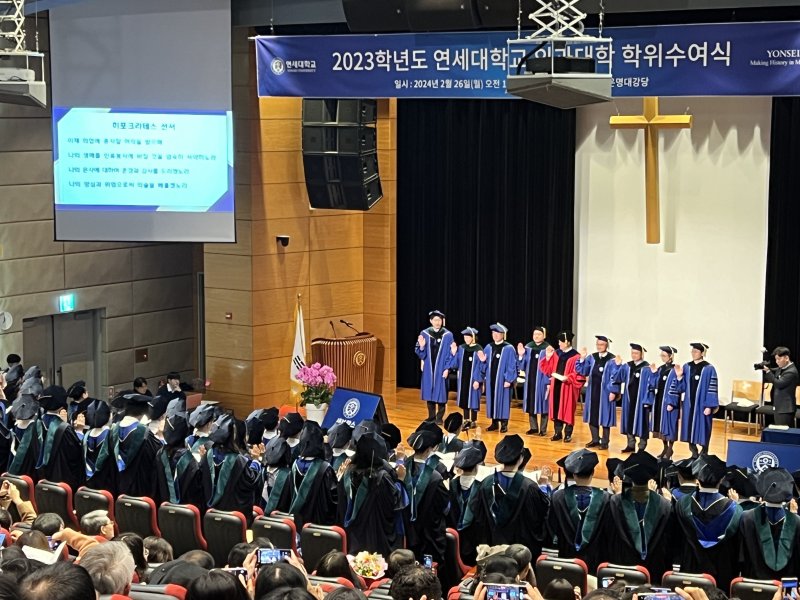 이 교수는 "힘든 과정들을 밟고 최고의 의과대학을 당당하게 졸업하는 여러분들이 주인공인 날"이라며 "어디를 가나 연세대 의대 졸업생으로서 선한 영향력을 끼치는 인물이 될 것으로 기대한다"고 축사를 끝마쳤다.
