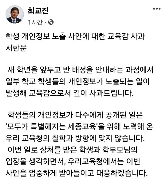 이와 관련 최교진 세종시교육감은 자신의 SNS를 통해 “새 학년을 앞두고 반 배정을 안내하는 과정에서 일부 학교 학생들의 개인정보가 노출되는 일이 발생해 교육감으로서 깊이 사과한다”고 밝혔다.