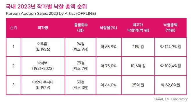특히 박서보, 이우환, 김창열 등 아티스트를 중심으로 2023년 홍콩 세일 점유율 약 5.0%를 차지했다. 해외에서 국내 미술품이 입지를 다져가고 있지만 내수시장은 금리 인상 등이 고가 미술품들의 낙찰에 영향을 미치면서 2022년 대비 낙찰총액 등이 감소한 모습을 보였다는 분석이다.