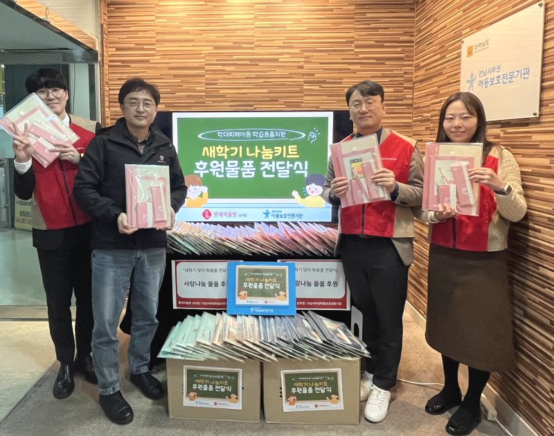 [무안=뉴시스]이창우 기자 = 롯데아울렛 남악점(점장 김대홍)은 전날 취약계층 아동을 위한 물품 나눔활동으로 전남 서부권 아동 보호 전문기관을 방문해 새학기 학용품 나눔키트를 전달했다고 27일 밝혔다.