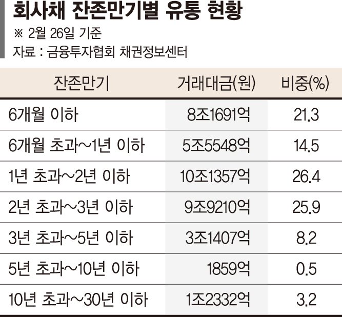 지난해 같은 기간과 비교하면 유통 회사채의 만기가 '단기화'되고 있다는 진단이다. 1년 전의 경우 잔존만기 6개월 이하 회사채 거래대금은 5조3751억원으로 절대치 자체도 적지만 비율(18.4%)로 따져도 올해보다 2.9%포인트 낮았다. 2년 초과~3년 이하(19.6%) 역시 6.3%포인트 뛰었다.