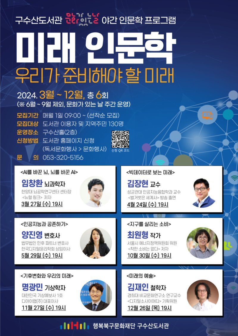 구수산도서관 관계자는 "강연을 통해 다가올 AI시대에 우리가 무엇을 준비해야 하고 어떻게 대처해야 할지 함께 고민해 보는 시간을 마련하고자 한다"고 말했다.