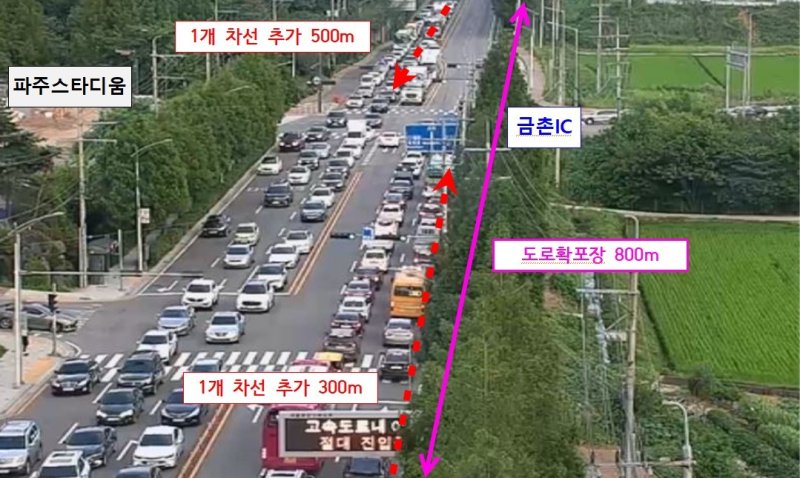 이에 파주시는 원활한 교통 흐름을 위해 25억원의 예산을 투입, 금촌나들목(IC) 주진입도로 800m 구간의 1차선을 추가로 확장한다. 지난달 27일 공사에 돌입했으며, 12월 개통을 목표로 지장물 이설, 도로포장 공사를 진행할 계획이다.