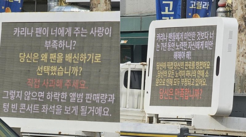 심지어 이날 SM엔터테인먼트 본사 앞에 에스파 해외 팬들이 보낸 것으로 추정되는 '시위 트럭'까지 등장하며 열애 인정의 후폭풍이 잦아들지 않고 있는 모양새다.