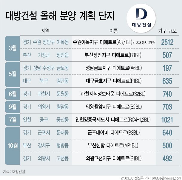 대방건설 관계자는 "시장 상황에 맞춰 변경될 가능성도 있지만 예정대로라면 작년의 두 배 가량 공급 물량이 늘어나는 것"이라며 "작년에 보수적으로 움직인 것도 있지만 올해 분양 단지들은 수요자들의 관심을 많이 받는 많은 단지들이라 공급 목표를 확대했다"고 설명했다.