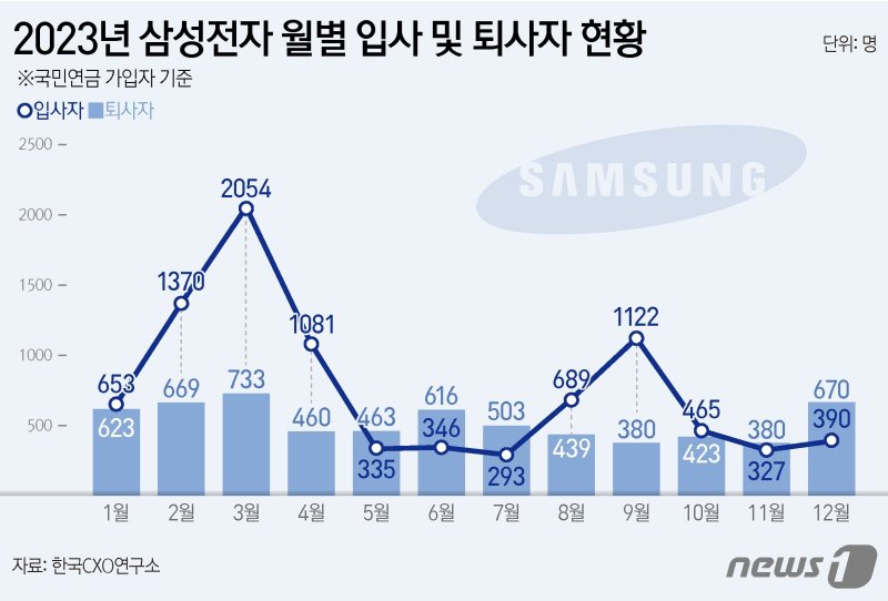 같은 해 삼성전자를 떠난 직원은 모두 6359명인 것으로 집계됐다. 그중 3월에만 733명(11.5%)이 퇴사했다. 이어 △12월 670명(10.5%) △2월 669명(10.5%) △1월 623명(9.8%) 순이었다.