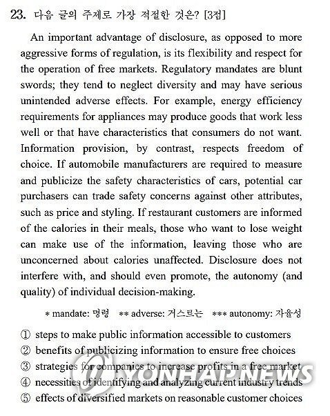 2022년 11월 시행된 2023학년도 수능 영어 23번은 캐스 선스타인 하버드대 로스쿨 교수가 출간한 'Too Much Information'(TMI)에서 발췌한 지문을 읽고 주제를 찾는 3점짜리 문항이었다.