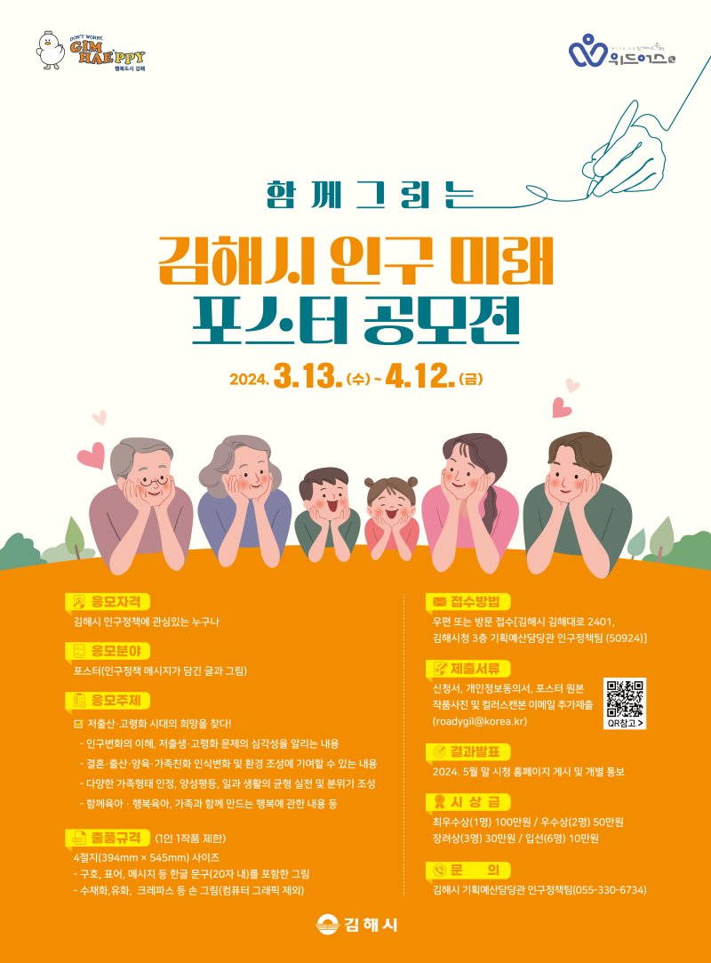 ‘저출산 고령화 시대의 희망을 찾다’라는 주제로 인구문제에 대한 시민 관심도를 높이고 출산 양육 가족친화 환경 분위기를 조성하고자 진행하는 공모전은 4월 12일까지 김해시 인구정책에 관심 있는 국민 누구나 응모 가능하다.