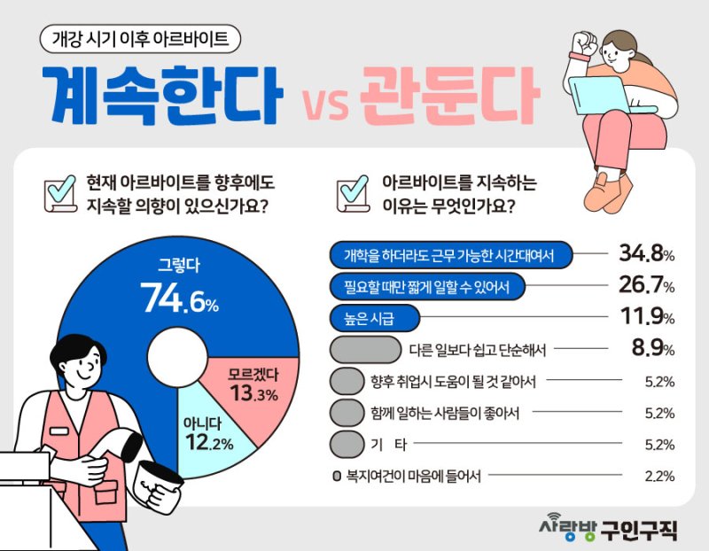 14일 광주·전남 취업포털 사랑방구인구직(job.sarangbang.com)이 지역민 391명을 대상으로 '개강 시기 이후 아르바이트 계속한다 vs 관둔다' 설문조사를 진행한 결과 이같이 나타났다.