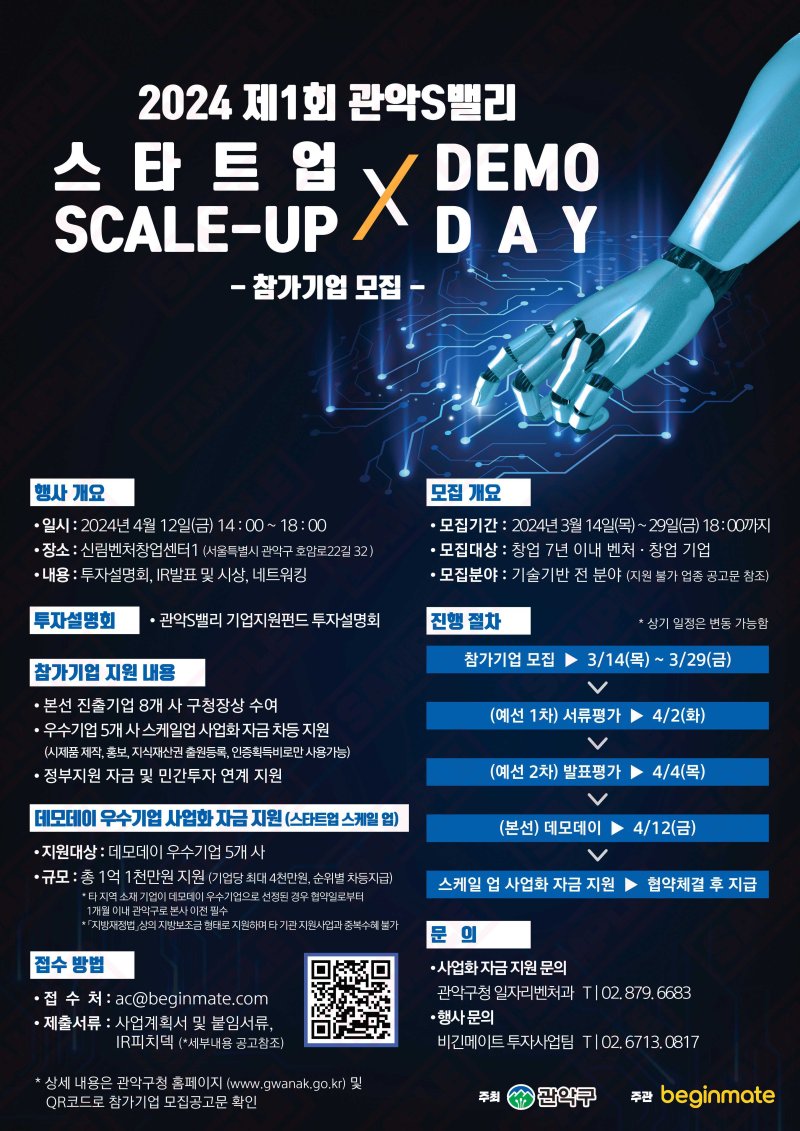 '2024 관악S밸리 스타트업 스케일 업 X 데모데이'는 벤처캐피털(VC), 엑셀러레이터(AC), 대기업벤처캐피털(CVC) 관계자를 심사위원으로 초청해 정보통신, 바이오, 환경에너지 등 첨단기술 기반 분야의 우수기업을 선정하는 자리다.