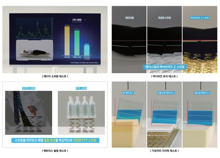 에너지 소비량 테스트는 피시험자의 목과 허리 4곳에 근전도 측정기를 부착한 후 전기 신호를 통해 스프링 종류에 따라 수면 중 뒤척일 때 발생하는 근육 사용량을 체크했다. 그 결과 뒤척일 때 근육 사용량이 많은 메모리폼과 독립형 스프링에 비해 하이브리드 Z 스프링은 뛰어난 탄성과 반발력으로 수면 시 불필요한 에너지 소비를 줄이는 것으로 나타났다.