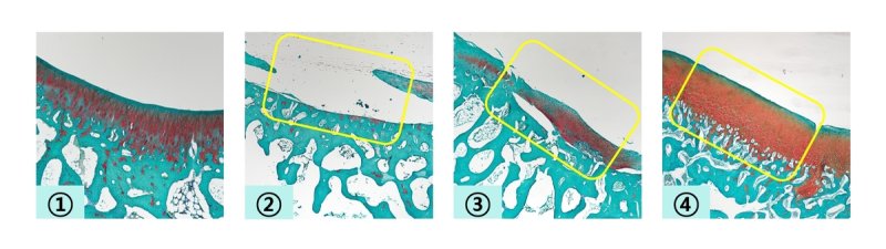 연구팀은 대퇴골 아래쪽 연골이 결손된 토끼 모델과 손상된 연골에 미세하게 상처를 내 골수 내 자가 줄기세포가 흘러나오게 한 미세천공술 적용 토끼 모델에 각각 TGF-β3 함유 히알루론산 겔을 적용해 12주간 경과를 살펴봤다.