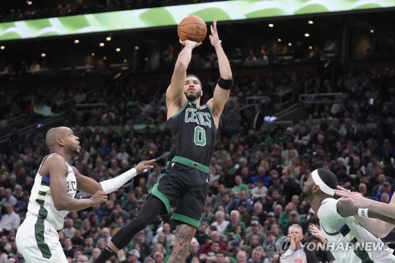 (서울=연합뉴스) 설하은 기자 = 미국프로농구(NBA) 동부 콘퍼런스 1·2위 맞대결에서 보스턴 셀틱스가 31점을 넣은 제이슨 테이텀의 활약에 힘입어 야니스 아데토쿤보가 빠진 밀워키 벅스를 3점 차로 간신히 이겼다.
