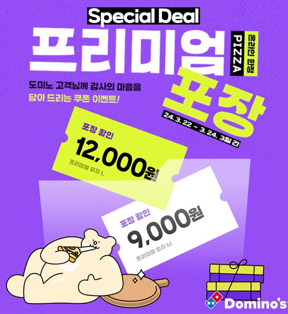 도미노피자의 '스페셜 딜' 프로모션은 온라인 회원 대상으로 온라인(홈페이지·모바일·웹·앱) 포장 주문 시 프리미엄 피자 라지(L) 사이즈와 미디움(M) 사이즈의 할인 혜택을 제공한다. 이 혜택은 1회 1판만 적용된다.