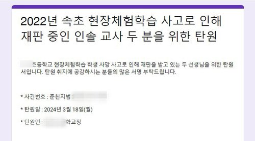 도내 초등학교장 A씨는 탄원서에서 "현장 체험학습 사고로 인해 재판받게 된 인솔 교사 2명을 위해 탄원을 부탁한다"며 "이들은 학생 안전을 위해 필요한 모든 조치를 했음에도 사고를 막지 못했다는 이유로 기소됐다"고 주장했다.