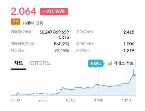 25일 오후 3시 빗썸 기준 크라토스 가격은 전날 같은 시간보다 무려 101.96% 오른 2.064원을 기록하고 있다.