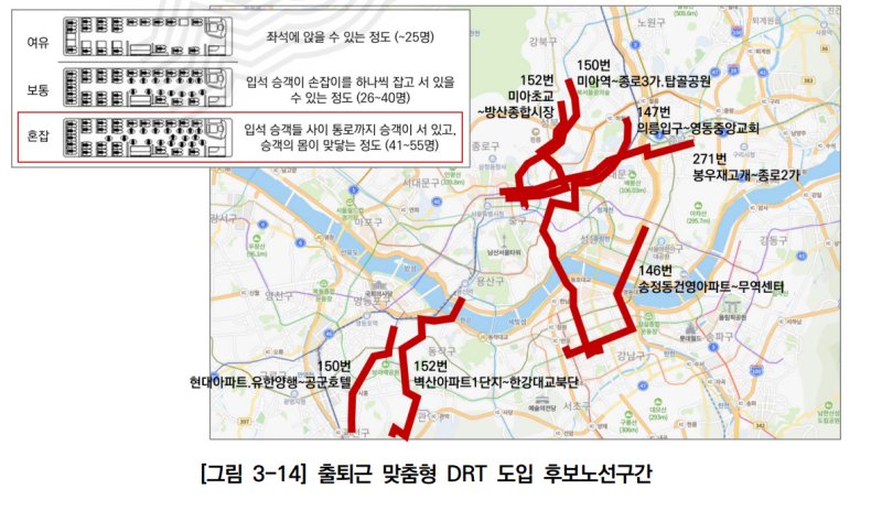연구팀은 "출퇴근 시간 만원 버스는 흔하게 접하는 과밀 문제지만 일상적으로 반복돼 위험 불감증이 만연하고 있다. 이런 문제를 해결하기 위해 출퇴근 시간대에 혼잡 구간만 운행하는 출퇴근 맞춤형 DRT 도입을 확대해야 한다"며 "서울시는 적정 혼잡 수준, 운영 지역, 요금 등에 관한 한정 면허 발급 기준을 수립하고 출퇴근 맞춤형 DRT 사업을 관리할 수 있는 절차를 마련해야 한다"고 했다.