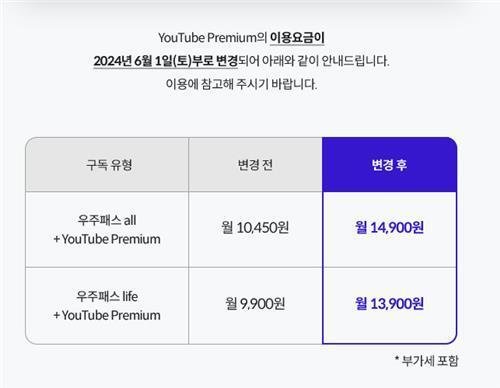 '우주패스 라이프'에 유튜브 프리미엄을 포함한 패키지는 기존 월 9900원에서 1만 3900원으로 오른다. '우주패스 올'(All)에 유튜브 프리미엄을 포함한 패키지는 월 1만 450원에서 월 1만 4900원이 된다.