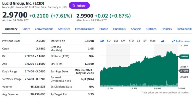 27일(현지시간) 뉴욕증시에서 루시드는 전거래일보다 7.61% 급등한 2.97달러를 기록했다.