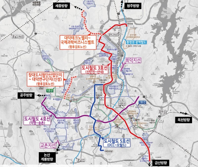 시는 도시철도 3·4·5호선 건설과 더불어 현재 추진 중인 충청권 광역철도 1·2단계, 대전~세종~충북 CTX, 대전~옥천 간 광역철도와 함께 장기적으로는 대전 주변 금산, 논산, 공주, 세종으로 도시철도 2·3·4호선을 연장하는 광역철도 사업을 통해 대전을 중심으로 한 충청권 메가시티 철도교통망 체계를 완성시킬 방침이다.