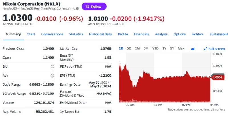 1일(현지시간) 뉴욕증시에서 니콜라는 전거래일보다 0.96% 하락한 1.03달러를 기록했다.