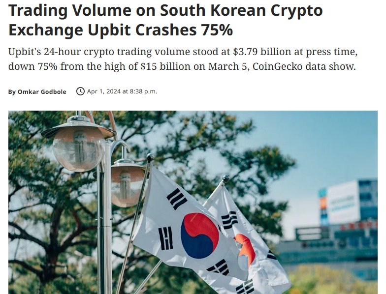 코인게코의 데이터에 따르면 1일 한국 최대 암호화폐거래소 업비트에서 암호화폐 거래량은 37억9000만달러였다. 이는 지난 3월 5일 기록했던 전고점 150억달러에 비해 75% 급락한 것이다.