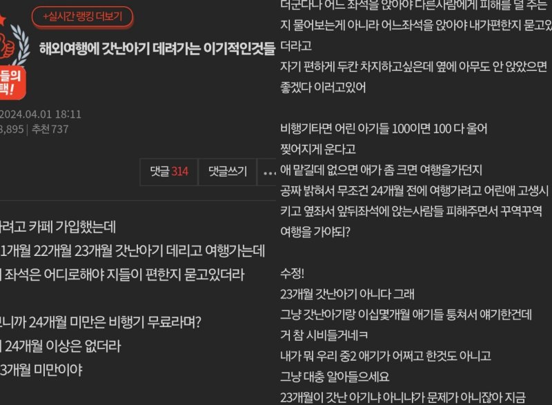 글쓴이는 해당 글에서 '해외 가려고 카페를 가입했는데 죄다 21개월, 22개월, 23개월 갓난아기 데리고 여행 가는데 비행기 좌석은 어디로 해야 자신들이 편한지 묻고 있더라'며 글을 쓰게 된 배경을 밝혔다.