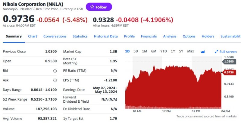이로써 니콜라는 2거래일 만에 주가가 다시 1달러 미만으로 떨어졌다.